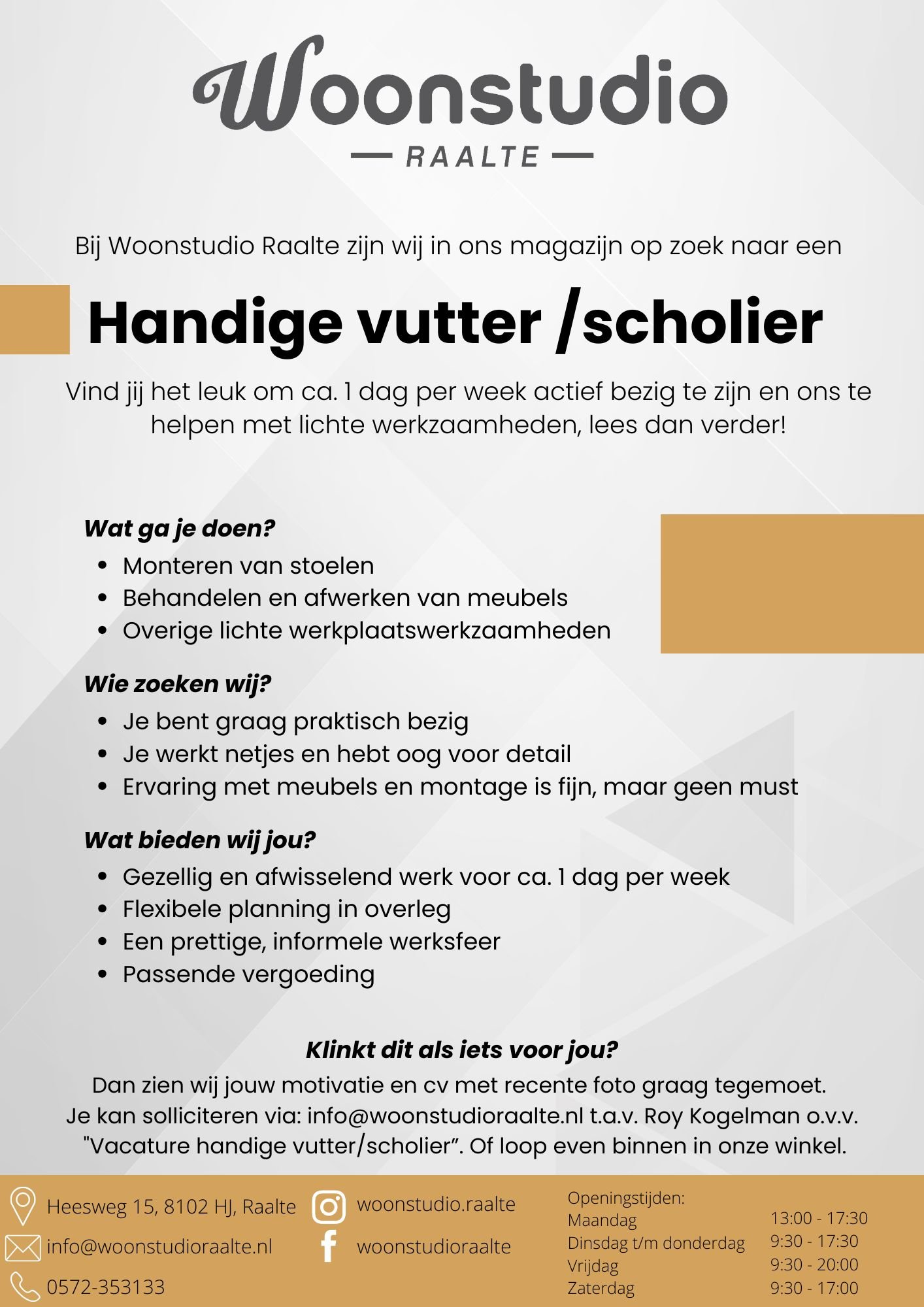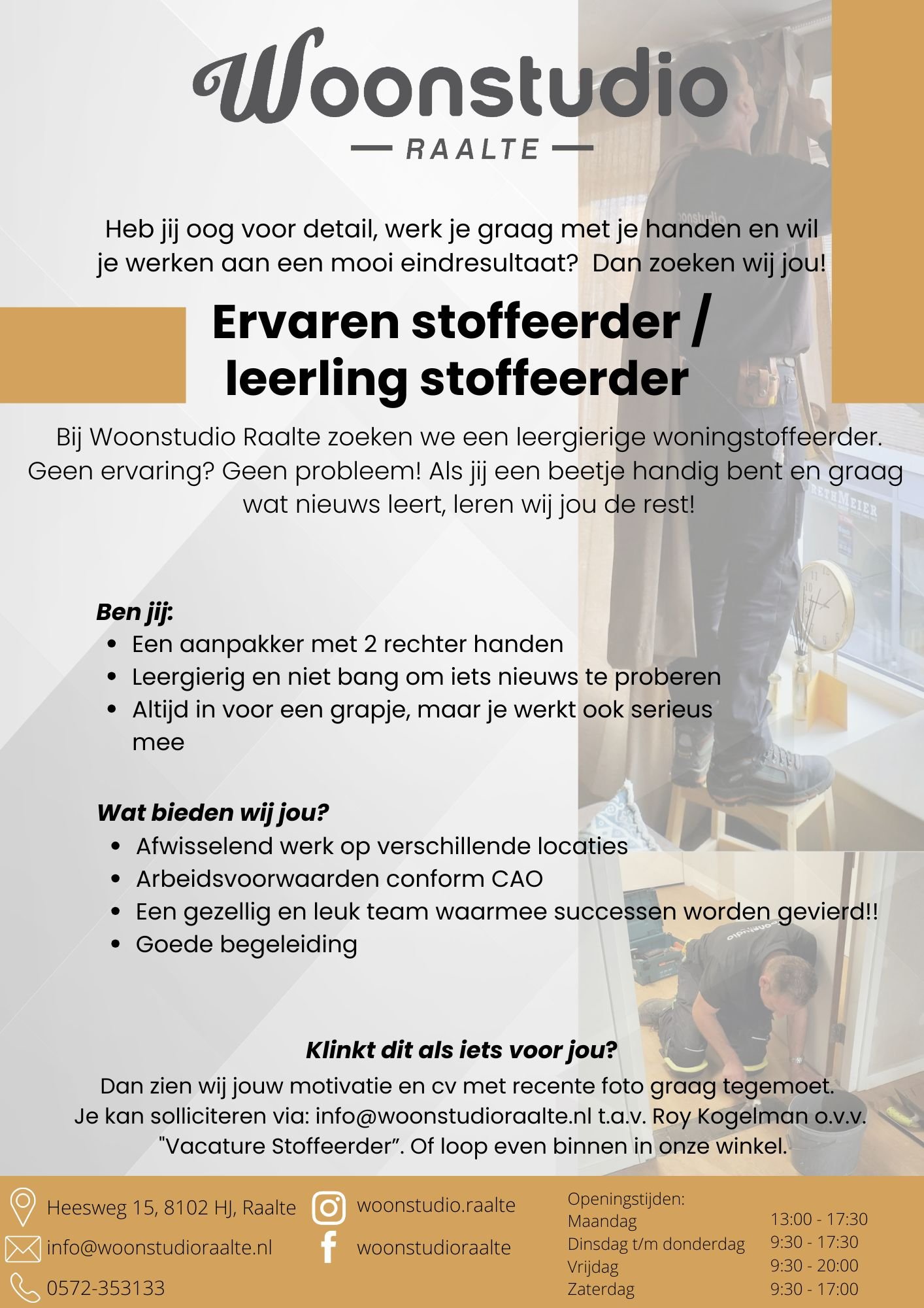 Enthousiast? Stuur dan je motivatie en cv (met recente foto) naar info@woonstudioraalte.nl t.a.v. Roy Kogelman o.v.v. “Vacature handige vutter/scholier” of “Vacature Ervaren stoffeerder / leerling stoffeerder” Of loop gerust even binnen in onze winkel!